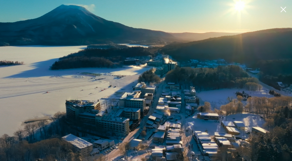 写っているのは、北海道釧路市にある阿寒湖温泉街と阿寒湖、