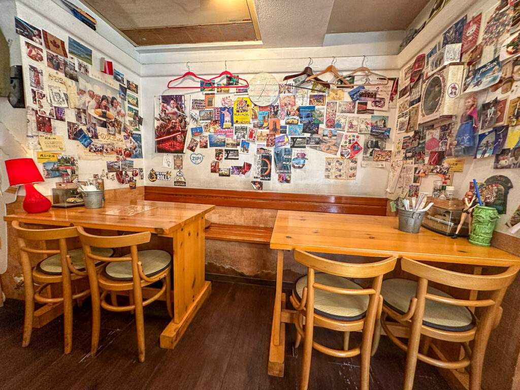 洋食店っぽいウッドのテーブルがこぢんまりとした洋食店ながら、